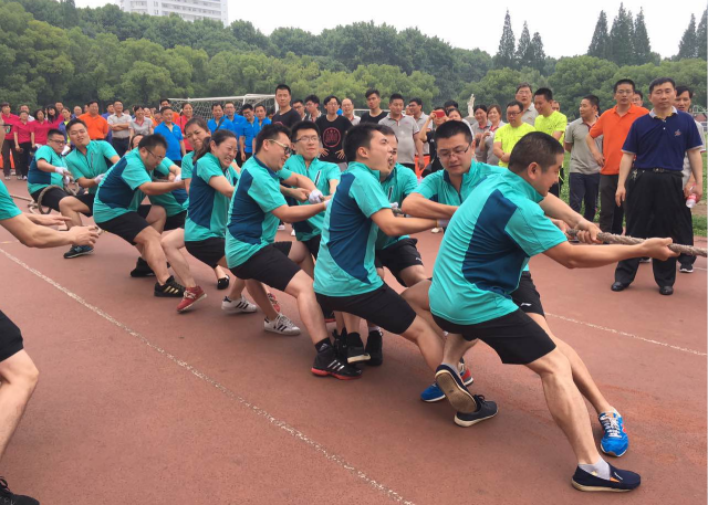 趣味运动会最精彩的当属团体竞技项目,十人十一足比赛环节,每队十人排成一排,腿部由布条绑缚,各参赛队整齐划一地喊着口令,飞奔在赛道上,大家争先恐后,体现着精诚团结的默契和信任。伴随着一声声加油呐喊,趣味运动会进行到最振奋人心的拔河项目。与江苏方圆对阵的是江苏省纺检院。比赛过程中,江苏方圆参赛队员紧紧握着绳子,众志成城、齐心协力,努力拼搏,坚守着阵地,尤其在胜负难分的僵持阶段,大家毫不退却,咬紧牙关,坚持到底。这一场“以退为进”的较量中,江苏方圆所有队员的心紧紧团结在一起,展现了江苏方圆精诚所至,勇往直前的精神风貌。
